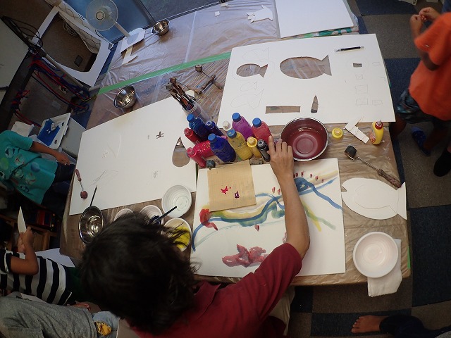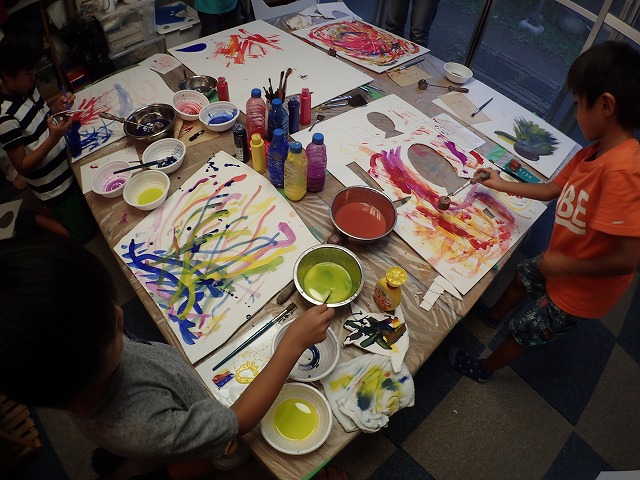 筆以外にもローラーやお好み焼きヘラなどの道具も使って、